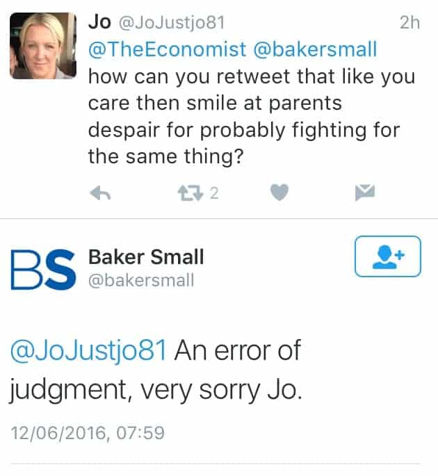 13. Baker Small’s conduct on Twitter is beyond shocking. Unprofessional, callous, immature, inflammatory, smug and borderline sadistic. My heart goes out to the parents and I hope they can let go of the anger they must be feeling. Local Authorities should clearly find alternative legal representation: a less adversarial approach is needed and continuing to pay the now toxic Baker Small with money from vulnerable taxpayers that BS have mocked is unacceptable. Baker Small have brought this on themselves – being held to certain standards of professionalism come with the territory.