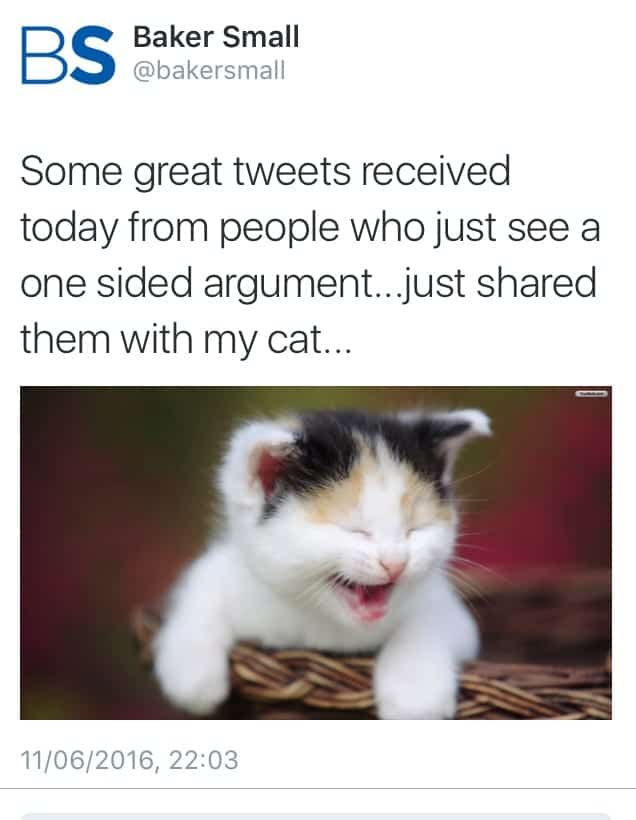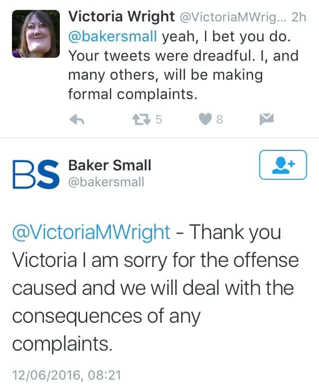 14. Baker Small have now deleted their Twitter account. Shame they don’t have the decency to apologise publicly rather than running to hide.