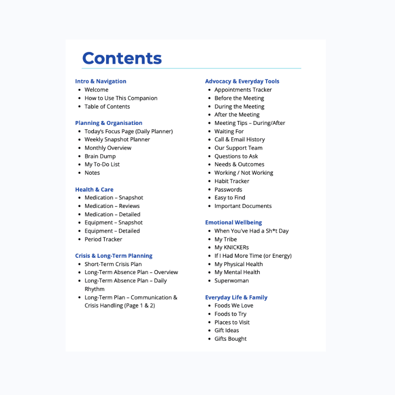 Parent Advocate Companion (PAC): full digital organiser with advocacy templates, health trackers, crisis plans, wellbeing prompts, and family organisers.